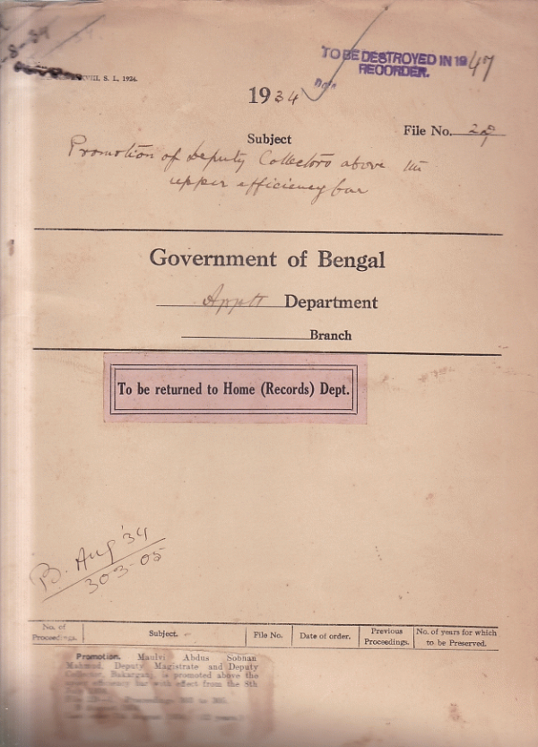| Rack No. 02, Bundle No. 12, Sl No. 708 Attachment of pay of Mulvi Muhammad Ilahdad, Sub-Deputy Collector and civil officer, 24-Parganas. | Rack No. 02, Bundle No. 12, Sl No. 709 Detention of witnesses over 3 days. | Rack No. 02, Bundle No. 12, Sl No. 710 Superior civil and central services (India Provident Fund) (Steeling Accounts) Rules. | Rack No. 02, Bundle No. 12, Sl No. 711 Promotion of Deputy Collector above the upper efficiency bar. | Rack No. 02, Bundle No. 12, Sl No. 712 Exclusion from Government Service of Mr. Hara Prashad Roy for submitting a falsified certificate as proof of his age. | Rack No. 02, Bundle No. 12, Sl No. 713 Question whether the report on the census of India Should be made a subject for the departmental exam for Junior Indian civil service and police officers. | Rack No. 02, Bundle No. 12, Sl No. 714 Supply of sufficient number of spare copies of Government letters and documents to heads of commissioners of Divisions. |