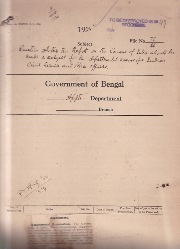 | Rack No. 02, Bundle No. 12, Sl No. 710 Superior civil and central services (India Provident Fund) (Steeling Accounts) Rules. | Rack No. 02, Bundle No. 12, Sl No. 711 Promotion of Deputy Collector above the upper efficiency bar. | Rack No. 02, Bundle No. 12, Sl No. 712 Exclusion from Government Service of Mr. Hara Prashad Roy for submitting a falsified certificate as proof of his age. | Rack No. 02, Bundle No. 12, Sl No. 713 Question whether the report on the census of India Should be made a subject for the departmental exam for Junior Indian civil service and police officers. | Rack No. 02, Bundle No. 12, Sl No. 714 Supply of sufficient number of spare copies of Government letters and documents to heads of commissioners of Divisions. | Rack No. 02, Bundle No. 12, Sl No. 715 Bengal European constituency of the Legislative Assembly, Electoral Roll. | Rack No. 02, Bundle No. 12, Sl No. 716 Proposed confirmation of a Deputy Superintendent of Police in a listed Post in the Indian Police. |