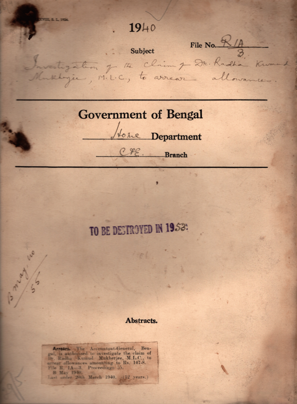 Investigation of the claims of Dr. Radha Kumud Mukherjee, M.L.A. to arrear allowance
