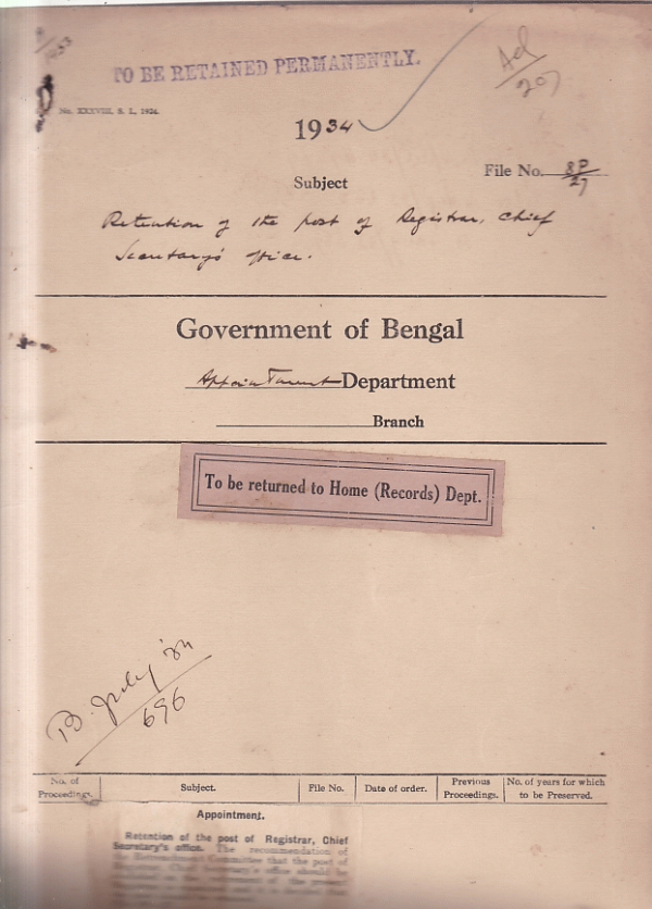 | Rack No. 02, Bundle No. 12, Sl No. 719 Promotion of Sub Deputy Collector to the Selection grade. | Rack No. 02, Bundle No. 12, Sl No. 720 Report of the birth of a daughter to Mr. J. De, I.C.S. District Judge of Noakhali. | Rack No. 02, Bundle No. 12, Sl No. 721 Application of Mulvi Abdul Rafiq Talukdar for admission to the Indian Police Examination. | Rack No. 02, Bundle No. 12, Sl No. 722 Retention of the post of Register, Chief Secy's office | Rack No. 02, Bundle No. 12, Sl No. 723 Application of Babu Bijan Kumar Sen for admission to the Indian Police Examination | Rack No. 02, Bundle No. 12, Sl No. 724 Promotion of Sub-Deputy Collectors above the efficiency bar. | Rack No. 02, Bundle No. 12, Sl No. 725 Application of Babu Sachindra Mohan Ghosh for admission to the I.P. Examination |