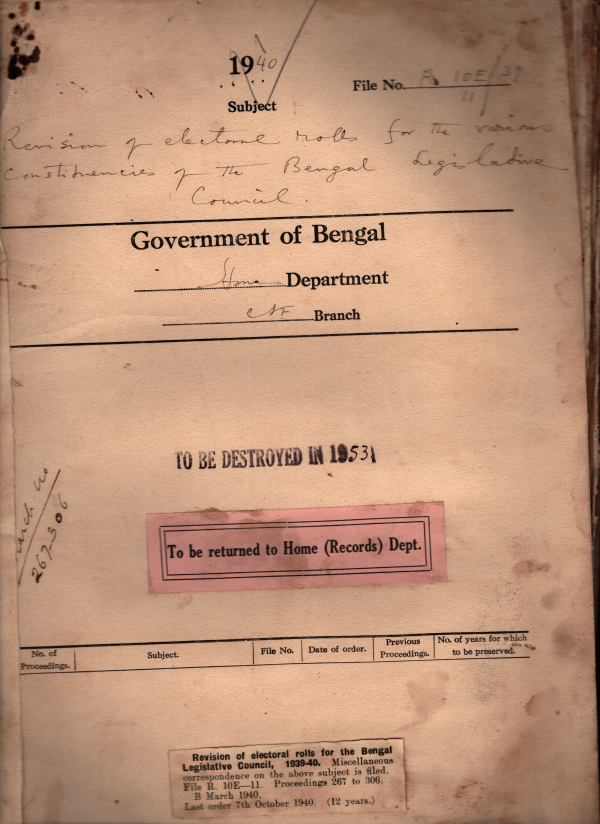 | Rack No. 08, Bundle No. 12; SI No. 724 Extension of the term of the temporary posts in the C+E branch. | Rack No. 08, Bundle No. 12; SI No. 725 Procedure for dealing with salary bills of members of the B.L.A. | Rack No. 08, Bundle No. 12; SI No. 726 Supply to the Bengal provincial Muslim League of a list of disqualified for election. | Rack No. 08, Bundle No. 12; SI No. 727 Revision of election rolls for the B.L.C. 1939-40. | Rack No. 08, Bundle No. 12; SI No. 728 By-election in the Bengal Chamber of commerce of the B.L.A. | Rack No. 08, Bundle No. 12; SI No. 729 Fixation of pay of the post of Secretary, B.L.C. while held by Mr. K.N. Majumdar. | Rack No. 08, Bundle No. 12; SI No. 730 Assent of H.E. the governor to the B.P.D.R. bill, 1939. |