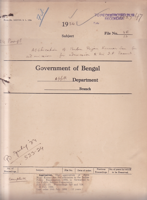 Application of Babu Bijan Kumar Sen for admission to the Indian Police Examination