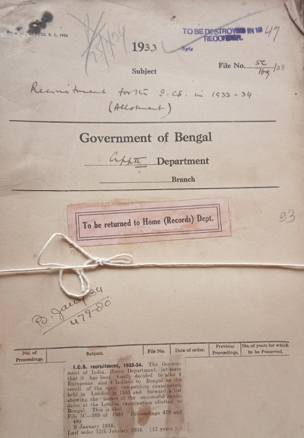 | Rack No. 2, Bundle No. 02, Sl No. 90 Boards Examination to the held in Calcutta on the 6th November 1933. | Rack No. 2, Bundle No. 02, Sl No. 91 Powers of Maulvi Diwan Naimul Haque Deputy Magistrate Bakarganj. | Rack No. 2, Bundle No. 02, Sl No. 92 Amendment to the Superior Civil Services Rules. | Rack No. 2, Bundle No. 02, Sl No. 93 Indian Civil Service Examination London, 1933. | Rack No. 2, Bundle No. 02, Sl No. 94 Confirmation of a Deputy Collector (Babu Surendra Nath Biswas). | Rack No. 2, Bundle No. 02, Sl No. 95 Investment of certain I.C.S. officers with the powers of a Magistrate of the first Class. | Rack No. 2, Bundle No. 02, Sl No. 96 Extension of leave of Babu Purna Chandra Bala, Sub-Deputy Collector. |