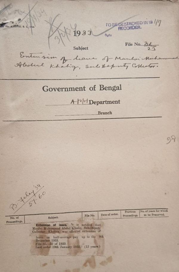 | Rack No. 2, Bundle No. 02, Sl No. 95 Investment of certain I.C.S. officers with the powers of a Magistrate of the first Class. | Rack No. 2, Bundle No. 02, Sl No. 96 Extension of leave of Babu Purna Chandra Bala, Sub-Deputy Collector. | Rack No. 2, Bundle No. 02, Sl No. 97 House allowance of Babu Jogendra Chandra Banarji Sub-Deputy Collector Civil Officer, Narayanganj, Dacca. | Rack No. 2, Bundle No. 02, Sl No. 98 Extension of leave of Maulvi. Muhammad Abdul Khaliq Sup-Deputy Collector. | Rack No. 2, Bundle No. 02, Sl No. 99 Request of Mr. Ramgati Banarji late of the Indian Police for supply of Papers. | Rack No. 2, Bundle No. 03, Sl No. 131 Portfolio. | Rack No. 2, Bundle No. 03, Sl No. 132 Postings of Dr. Magistrates in December 1933. |
