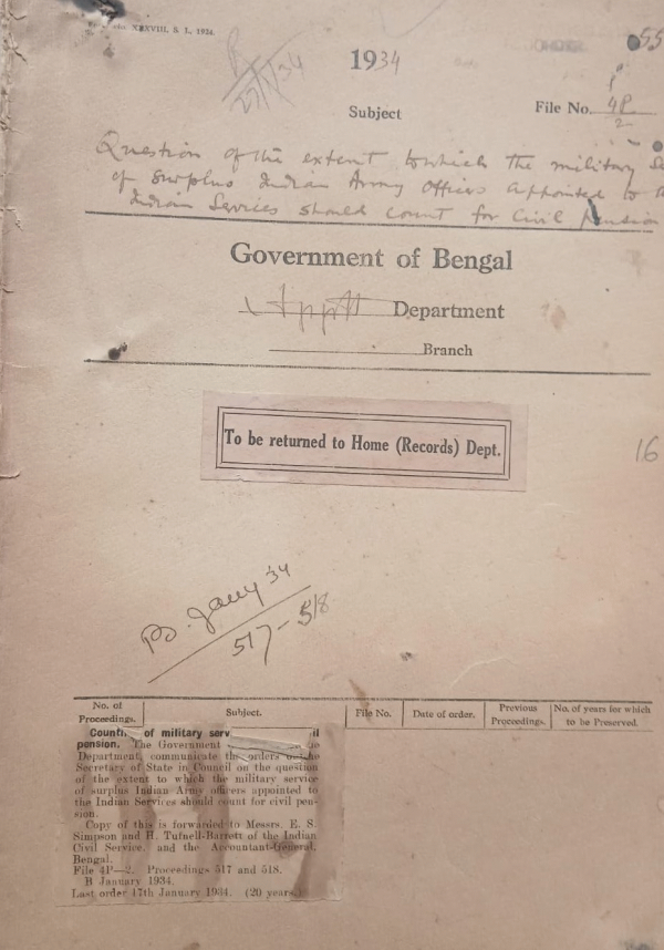 | Rack No. 2, Bundle No. 02, Sl No. 113 Enquiry by the A.G. Bengal as with the of appointment of Mr. R. A. S Stacy to the I.C.S. | Rack No. 2, Bundle No. 02, Sl No. 114 Retirement of Mr. H. Quinton I.C.S. on proportionate pension. | Rack No. 2, Bundle No. 02, Sl No. 115 Resignation of the Reverend W. Bolton from the Indian Ecclesiastical establishment. | Rack No. 2, Bundle No. 02, Sl No. 116 Question of the extent to which the military services of surplus Indian Army officers appointment to the Indian Services should count for Civil Pension | Rack No. 2, Bundle No. 02, Sl No. 117 Tailor of Maulvi Ali Ahmed Sub-Deputy collector on probation to pass his department examination with two exams of the date of his appointment. | Rack No. 2, Bundle No. 02, Sl No. 118 Procedure to be followed for wide publicity of the vie us and schemes of Government | Rack No. 2, Bundle No. 02, Sl No. 119 Interpretation of note 1 to Article 465A. Civil service Regulations. |