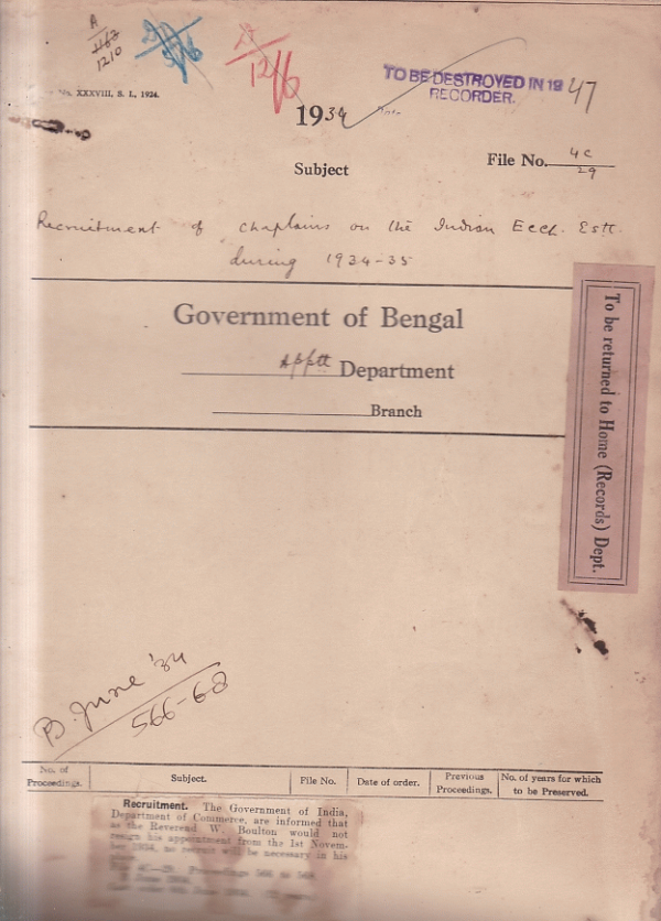 | Rack No. 02, Bundle No. 12, Sl No. 725 Application of Babu Sachindra Mohan Ghosh for admission to the I.P. Examination | Rack No. 02, Bundle No. 12, Sl No. 726 Application of Babu Pranab Kumar Sen for admission to the I.P. Exam, 1934. | Rack No. 02, Bundle No. 12, Sl No. 727 Budget estimates of the Christian Burial Board for 1934-35. | Rack No. 02, Bundle No. 12, Sl No. 728 Recruitment of Chaplains on the Indian Ecclesiastical Establishment during 1934-35. | Rack No. 02, Bundle No. 12, Sl No. 729 Application of Mulvi Muhammad Nuruzzman Khan for admission to the Indian Police Examination | Rack No. 02, Bundle No. 12, Sl No. 730 Application of Mulvi Muhammad Nural Karim for admission to the I.P. Examination | Rack No. 02, Bundle No. 12, Sl No. 731 Application of Mulvi Muhammad Shamsul Haq for admission to the Indian Police Examination |