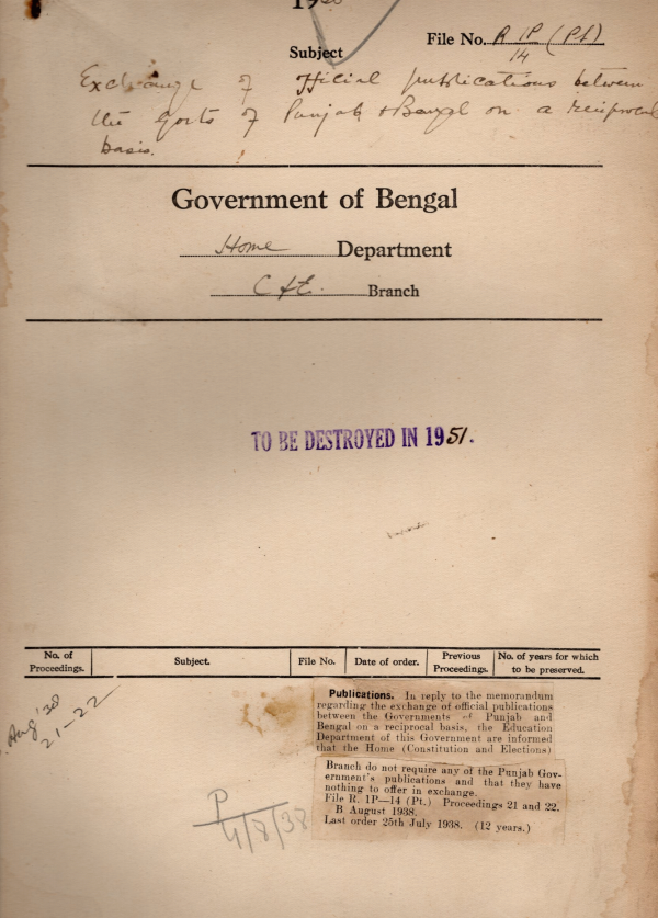 Exchange of official publications between the govt. of Punjab and Bengal on a reciprocal basis.