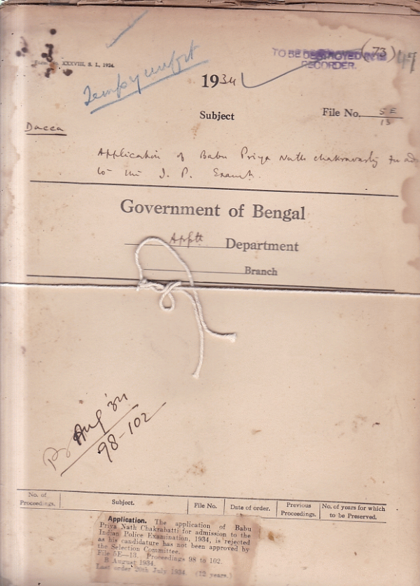 Application of Babu Priya Nath Chakrabatti for admission to the I.P. Exam.