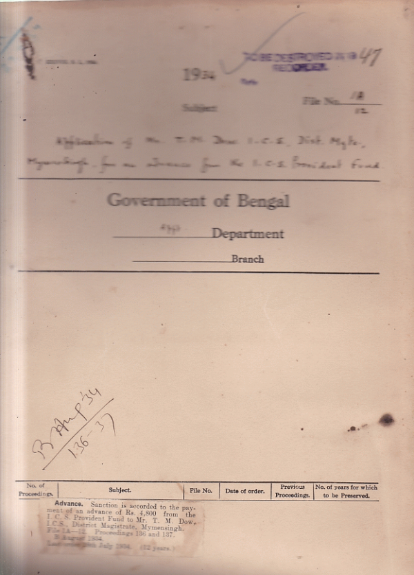 Application of Mr. T.M. Dow, I.C.S. District Magistrate, Mymensingh for an advance from the I.C.S. Provident fund.