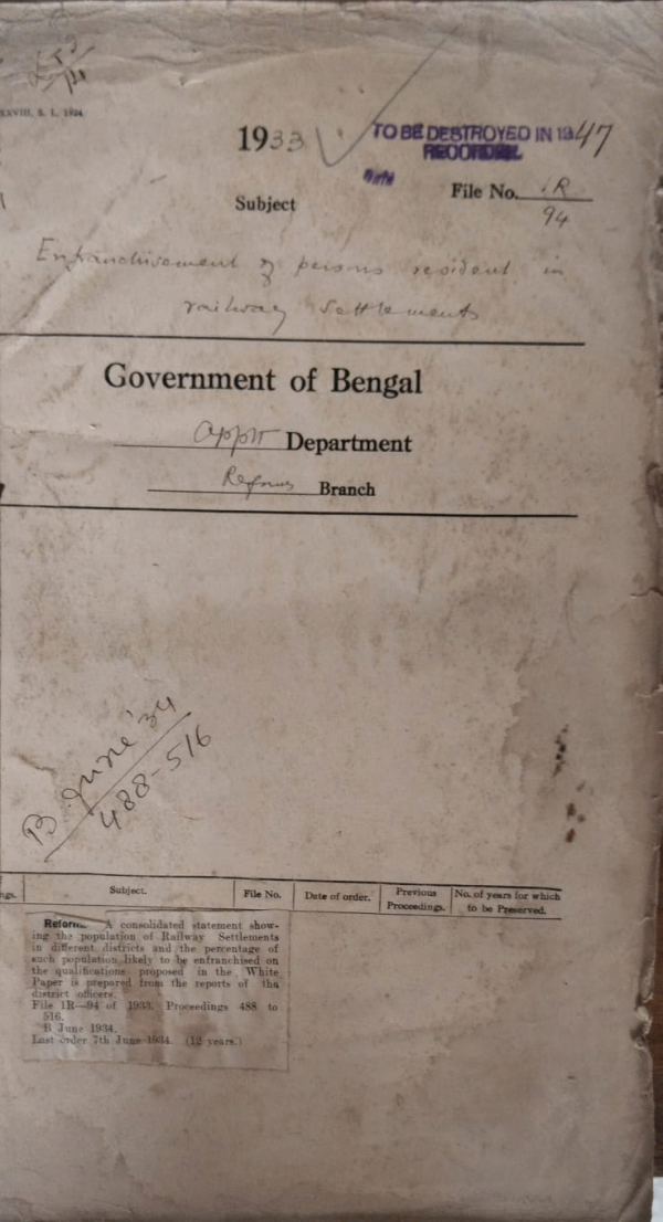 | Rack No. 2, Bundle No. 7, Sl No. 410 Third Class powers of Mulvi Abdul Majid, Sub-Deputy Magistrates, Bogra. | Rack No. 2, Bundle No. 8, Sl No. 411 System of reservation of seats in elections for particular communities in Bombay and Madras. | Rack No. 2, Bundle No. 8, Sl No. 412 Preparation of Provisional electoral rolls of Calcutta for the reformed legislatures. | Rack No. 2, Bundle No. 8, Sl No. 413 Enfranchisement of pensions resident in railway Settlement. | Rack No. 2, Bundle No. 8, Sl No. 414 Representation of the Noakhali Tippera Buddhist Association in connection with the recording of the names of Buddhist Rajbanshi of Nokhali and Tippera in the electoral rolls. | Rack No. 2, Bundle No. 8, Sl No. 415 Estimate of voters for the provincial upper Chamber | Rack No. 2, Bundle No. 8, Sl No. 416 Re-instatement of Mulvi Ali Ahmed Sub-Deputy Collector is reinstating in his appointment and posted to the Chittagong Division. |