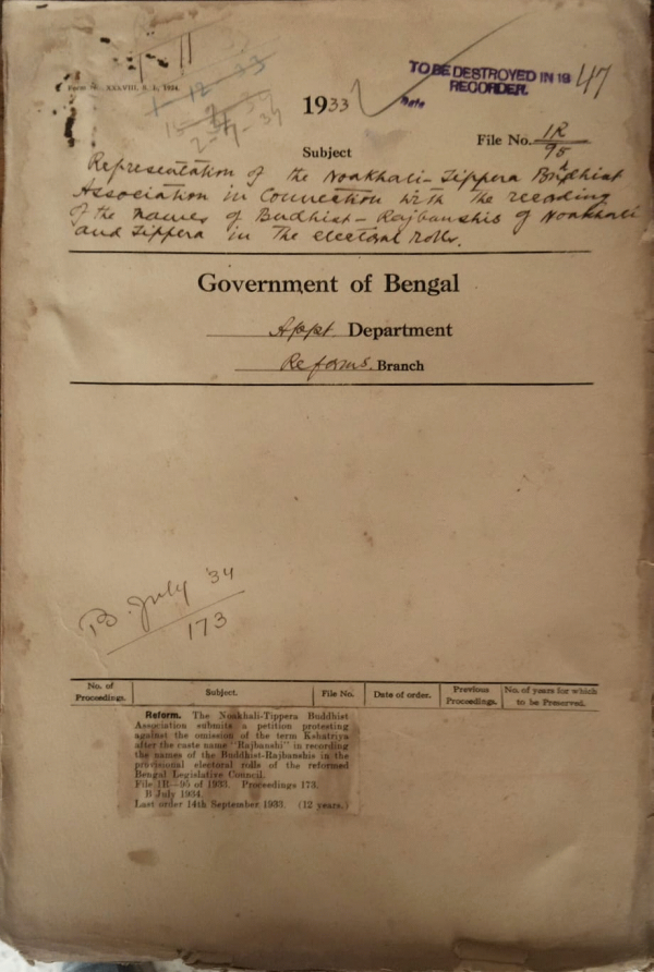 Representation of the Noakhali Tippera Buddhist Association in connection with the recording of the names of Buddhist Rajbanshi of Nokhali and Tippera in the electoral rolls.