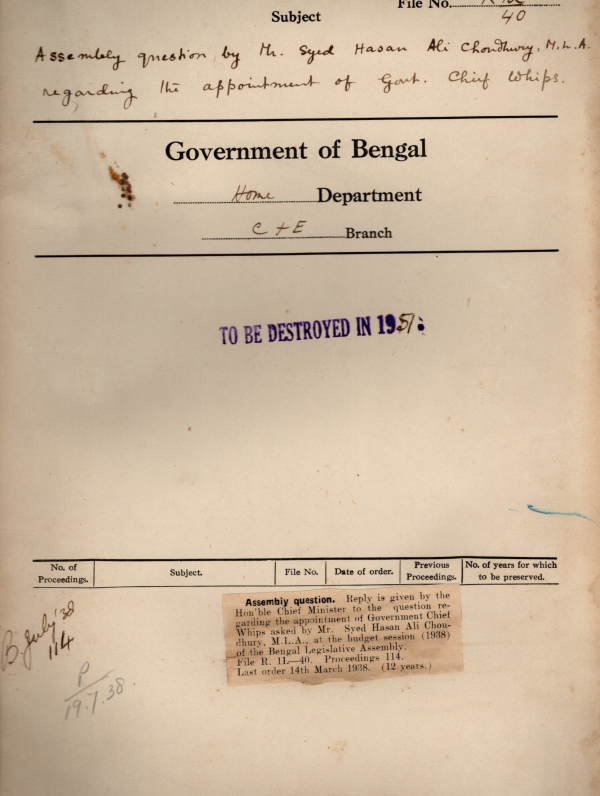 | Rack No. 08, Bundle No. 04, SI No. 213 Accuracy of Budgeting. | Rack No. 08, Bundle No. 04, SI No. 214 Assembly question by Maulana Md. Abdul Aziz, M.L.A. regarding appointment of official’s whips and parliamentary Secretaries. | Rack No. 08, Bundle No. 04, SI No. 215 Authorities responsible for control of expenditure in each demand for grant. | Rack No. 08, Bundle No. 04, SI No. 216 Assembly question by Mr. Syed Hasan Ali Choudhury M.L.A. regarding the appointment of govt. | Rack No. 08, Bundle No. 04, SI No. 217 Rules regarding Discretionary grants by the Honorable Chief Minister. | Rack No. 08, Bundle No. 04, SI No. 218 Supply of a list of publications on Indian Constitutional Reform to the Bengal legislative Assembly Department. | Rack No. 08, Bundle No. 04, SI No. 219 Method of determining the date of Birth of a govt. Servant whose age only is known at the time of Appointment. |