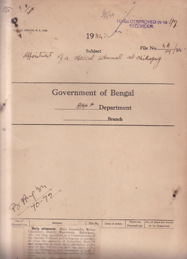 | Rack No. 02, Bundle No. 12, Sl No. 754 Application of Babu F.M. Mukharji for an employment under Government | Rack No. 02, Bundle No. 12, Sl No. 755 Creation of a temporary for the Honorable Mr. J.A.L. Swan, C.S.I., C.I.E., I.C.S. | Rack No. 02, Bundle No. 12, Sl No. 756 Application of Mr. M.M. Stuart, I.C.S. for permission to appear at Interpretation ship exam in Bengal. | Rack No. 02, Bundle No. 12, Sl No. 757 Appointment of a special tribunal at Chittagong. | Rack No. 02, Bundle No. 12, Sl No. 758 Proposal for the posting of a Deputy Magistrate with appellate powers to Noakhali. | Rack No. 02, Bundle No. 12, Sl No. 759 Question whether leave earned by deputation should be deemed to be consumed immediately following the deputation. | Rack No. 02, Bundle No. 12, Sl No. 760 Grant of personal pay to officers, who have been exempted from percentage cut in pay wholly or partially. |