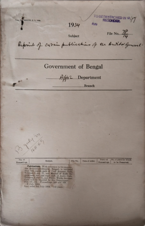 | Rack No. 2, Bundle No. 8, Sl No. 427 Request of Mr. B.C. Pranc. I.C.S. Magistrate & Collector, Dacca for the grant of T.A. to his during the period of his employment. | Rack No. 2, Bundle No. 8, Sl No. 428 Proposed appointment of Khan Bahadur M. Sahamsuddahar, Assistant Commissioner of Police. | Rack No. 2, Bundle No. 8, Sl No. 429 Assumption of charge by Mr. K.N. Majundar, Bar-al-law, first Assistant Secretary to Government of Bengal, legislative Department. | Rack No. 2, Bundle No. 8, Sl No. 430 Reprint of certain publications of the Auditor General. | Rack No. 2, Bundle No. 8, Sl No. 431 Procedure for appointment of Deputy Collectors in Charge of wards estates in certain districts. | Rack No. 2, Bundle No. 8, Sl No. 432 Extension of Babu Suresh Chandra Das Gupta, Sub-Deputy Collector. | Rack No. 2, Bundle No. 8, Sl No. 433 Issue of a certificate regarding transfer of Mr. K.A.L. Hill, I.C.S. to Bakarganj to Khulna in the interest of Public Service. |