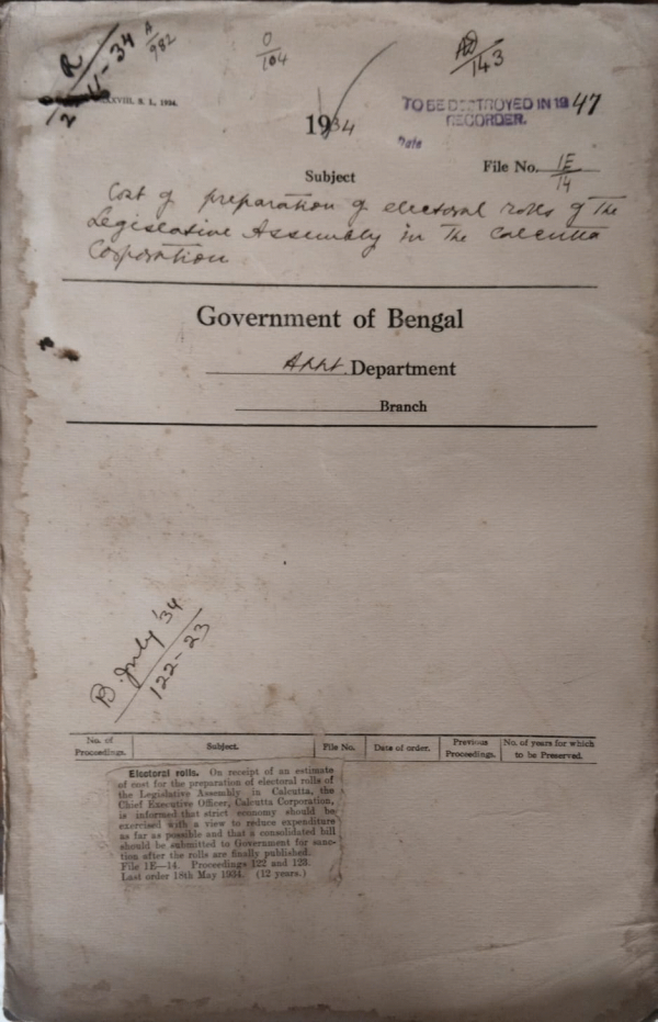 | Rack No. 2, Bundle No. 8, Sl No. 432 Extension of Babu Suresh Chandra Das Gupta, Sub-Deputy Collector. | Rack No. 2, Bundle No. 8, Sl No. 433 Issue of a certificate regarding transfer of Mr. K.A.L. Hill, I.C.S. to Bakarganj to Khulna in the interest of Public Service. | Rack No. 2, Bundle No. 8, Sl No. 434 Increment of Pay of I.C.S. officers on the result of the departmental examination held in may 1934. | Rack No. 2, Bundle No. 8, Sl No. 435 Cost of preparation of electoral rolls of the legislative Assembly in the Calcutta Corporation. | Rack No. 2, Bundle No. 8, Sl No. 436 Formation of a selection Committee for the Indian Police Examination, 1934. | Rack No. 2, Bundle No. 8, Sl No. 437 Warning to Mulvi A. Quader, Deputy Collector on probation who has only one more chance to pass the Departmental Exam, before, completing two years service. | Rack No. 2, Bundle No. 8, Sl No. 438 List of castes designated as scheduled castes. |