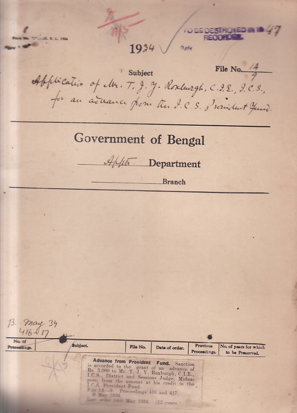 Application of Mr. T.J.Y. Roxburh, C.I.E. I.C.S. for an advance from the I.C.S. provident fund.