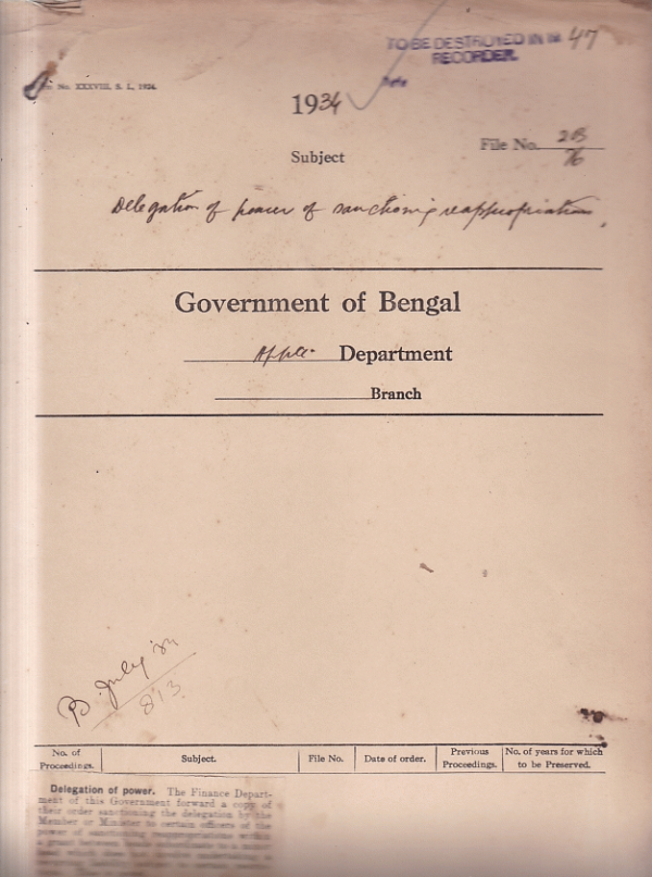 | Rack No. 02, Bundle No. 12, Sl No. 763 Application of Mr. T.J.Y. Roxburh, C.I.E. I.C.S. for an advance from the I.C.S. provident fund. | Rack No. 02, Bundle No. 12, Sl No. 764 Retirement of Mr. E.S. Jones, Deputy Superintendent of Police, from Government Services. | Rack No. 02, Bundle No. 12, Sl No. 765 Confirmations in the Grade of District Judges. | Rack No. 02, Bundle No. 12, Sl No. 766 Delectation of power of sanctioning re-appropriation. | Rack No. 02, Bundle No. 12, Sl No. 767 Confirmation in the grade of Magistrates and collectors. | Rack No. 02, Bundle No. 12, Sl No. 768 Second class powers of Mulvi Asad Hussain, Sub-Deputy Collector, Murshidabad. | Rack No. 02, Bundle No. 12, Sl No. 769 Advance from the I.C.S. Provident Fund (Mr. J. George, I.C.S.). |