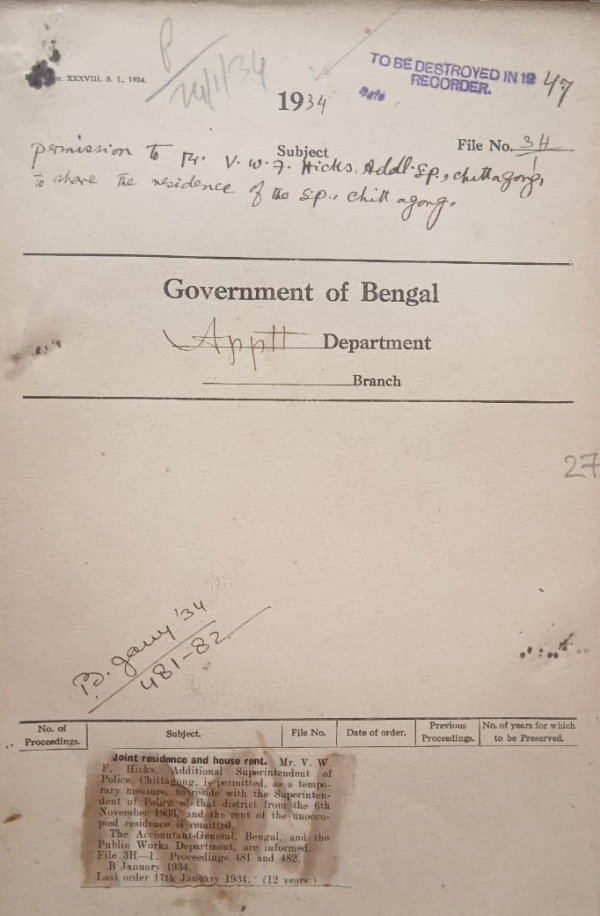 Permission to Mr. V.W. F. Hicks AdditionalS.P. Chittagong above the residence of the S.P. Chittagong.