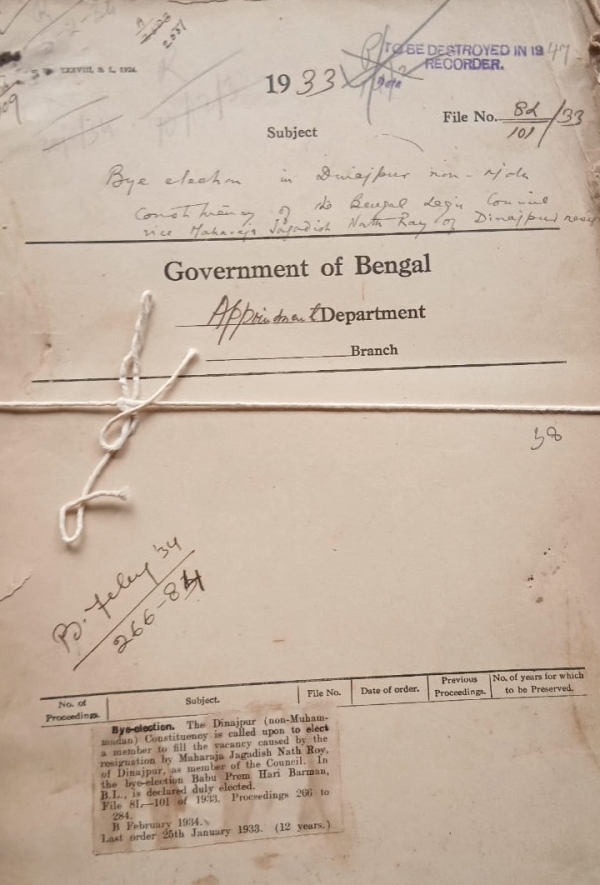 By-election in Dinajpur non-Muhammadan Constituency of the Bengal Legislative council vice Maharaja Jagadish Nath Roy of Dinajpur.