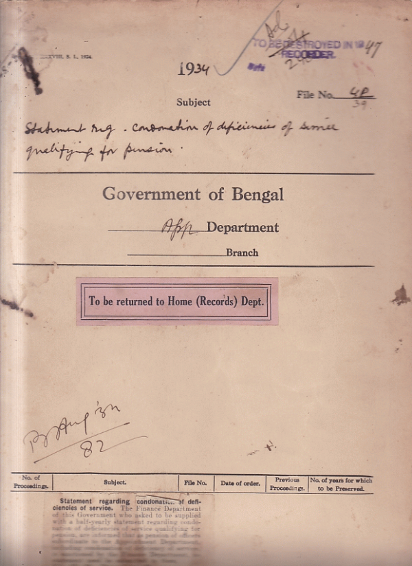 | Rack No. 02, Bundle No. 12, Sl No. 774 Proposal for the appointment of a temporary Additional Judge at Alipore 24-Parganas. | Rack No. 02, Bundle No. 12, Sl No. 775 Third Class powers of Mulvi Ali Ahmed, Sub-Deputy Collector, on probation, Jalpaiguri. | Rack No. 02, Bundle No. 12, Sl No. 776 First class powers of Mulvi Saadat Husain Chaudhuri, Deputy Magistrate Chittagong. | Rack No. 02, Bundle No. 12, Sl No. 777 Statement regarding condonation of deficiencies of service qualifying for Pension. | Rack No. 02, Bundle No. 12, Sl No. 778 Conduct of Babu Gyan Ranjan Mukharji, Sub-Deputy Collector, 24- Pargans. | Rack No. 02, Bundle No. 12, Sl No. 779 Posting of Sub-Deputy Collectors during the month of August 1934. | Rack No. 02, Bundle No. 12, Sl No. 780 Extension of leave and retirement of MulviLutfar Rahman Tarafdar, Deputy Magistrate and Deputy Collector. |
