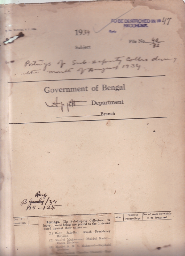 | Rack No. 02, Bundle No. 12, Sl No. 776 First class powers of Mulvi Saadat Husain Chaudhuri, Deputy Magistrate Chittagong. | Rack No. 02, Bundle No. 12, Sl No. 777 Statement regarding condonation of deficiencies of service qualifying for Pension. | Rack No. 02, Bundle No. 12, Sl No. 778 Conduct of Babu Gyan Ranjan Mukharji, Sub-Deputy Collector, 24- Pargans. | Rack No. 02, Bundle No. 12, Sl No. 779 Posting of Sub-Deputy Collectors during the month of August 1934. | Rack No. 02, Bundle No. 12, Sl No. 780 Extension of leave and retirement of MulviLutfar Rahman Tarafdar, Deputy Magistrate and Deputy Collector. | Rack No. 02, Bundle No. 12, Sl No. 781 Promotion out-side the ordinary line, in an officers service. | Rack No. 02, Bundle No. 12, Sl No. 782 Return of Certificate field by Babu Sishir Kumar Bandopadhya, a candidate for Indian Police 17Examination. |