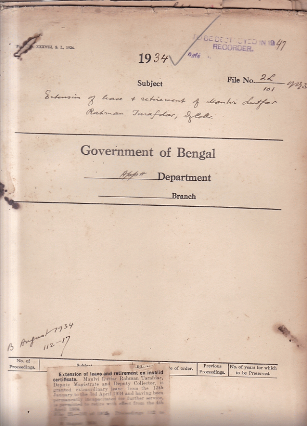 Extension of leave and retirement of MulviLutfar Rahman Tarafdar, Deputy Magistrate and Deputy Collector.