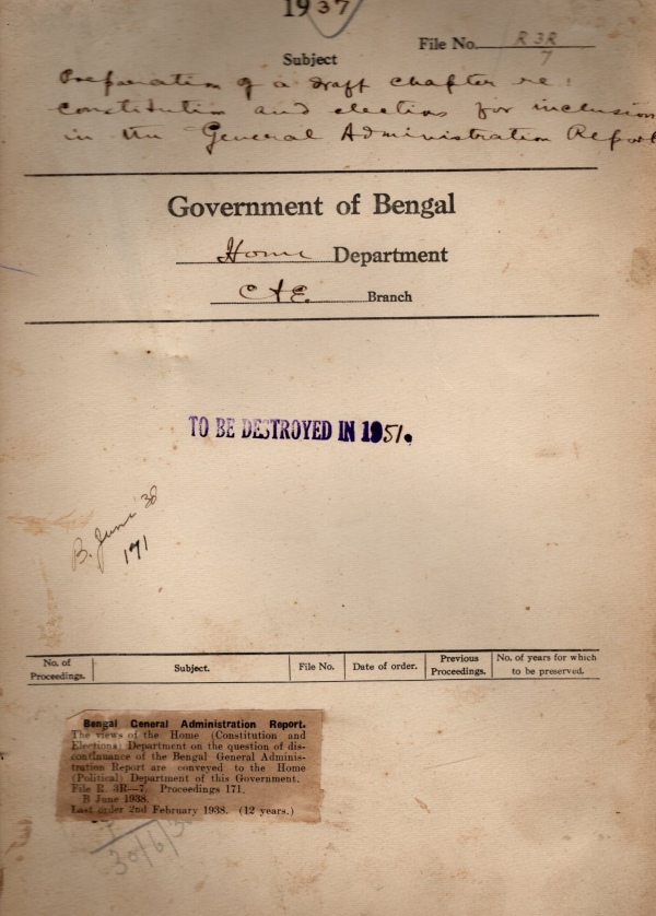 | Rack No. 08, Bundle No. 05, SI No. 225 Proposal to provide electrically Illuminated signs of Ayes & Notes in the Bengal Legislative Chamber, Calcutta. | Rack No. 08, Bundle No. 05, SI No. 226 A.Q. b Babu Upendra Nath Barman regarding election petitions. | Rack No. 08, Bundle No. 05, SI No. 227 A. Q. by Mr. Debendra Lall Khan regarding the holding of Durbar by District Magistrate, Midnapore. | Rack No. 08, Bundle No. 05, SI No. 228 Preparation of a Draft regarding constitution & elections for inclusion in the general Administration Report. | Rack No. 08, Bundle No. 05, SI No. 229 Additional + alterations in the first temporary building in the legislative Building Compound. | Rack No. 08, Bundle No. 05, SI No. 230 Previous sanction to the introduction of the Bengal Famine Insurance Fund Bill, 1937. | Rack No. 08, Bundle No. 05, SI No. 231 Pay of Honorable Mr. Justice N.G.A. Edgley, I.C.S. as president of the Election Tribunal. |