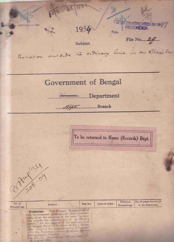 | Rack No. 02, Bundle No. 12, Sl No. 778 Conduct of Babu Gyan Ranjan Mukharji, Sub-Deputy Collector, 24- Pargans. | Rack No. 02, Bundle No. 12, Sl No. 779 Posting of Sub-Deputy Collectors during the month of August 1934. | Rack No. 02, Bundle No. 12, Sl No. 780 Extension of leave and retirement of MulviLutfar Rahman Tarafdar, Deputy Magistrate and Deputy Collector. | Rack No. 02, Bundle No. 12, Sl No. 781 Promotion out-side the ordinary line, in an officers service. | Rack No. 02, Bundle No. 12, Sl No. 782 Return of Certificate field by Babu Sishir Kumar Bandopadhya, a candidate for Indian Police 17Examination. | Rack No. 02, Bundle No. 12, Sl No. 783 Sitting of Sub-Deputy Collector in July 1934. | Rack No. 02, Bundle No. 12, Sl No. 784 Posting of AdditionalJudge. |