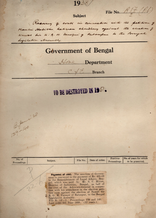 Recovery of costs in connection with the petition of Mualvi Habibur Rahman Choudhury against the election of Nawab Sir K.G.M. Faroqui of Ratenpur to the B.L.A.