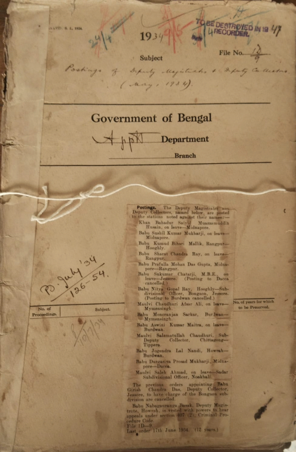 | Rack No. 2, Bundle No. 8, Sl No. 448 Report of the Sind Administrative Committee. | Rack No. 2, Bundle No. 8, Sl No. 449 Postings of ICS officers (Judicial) in June & July. | Rack No. 2, Bundle No. 8, Sl No. 450 Proposed confirmation of certain B.C.S. (Judl.) officers in listed posts of District and sessionion judges. | Rack No. 2, Bundle No. 8, Sl No. 451 Posting of Deputy Magistrate & Deputy Collectors, May, 1934. | Rack No. 2, Bundle No. 8, Sl No. 452 Annual report on the working of the Co-operative Societies in Bengal, June 1933. | Rack No. 2, Bundle No. 8, Sl No. 453 Distribution of port folios and the appointment of the Honorable Sir B.L. Mitter, K.C.S.I. and the Honorable Khwaja Nazim Uddin K.C.I.E. as member of the Bengal Executive council. | Rack No. 2, Bundle No. 8, Sl No. 454 Supply of Character reports of Bengal Civil Service officers recommended for promotion to listed posts of District Session Judges. |