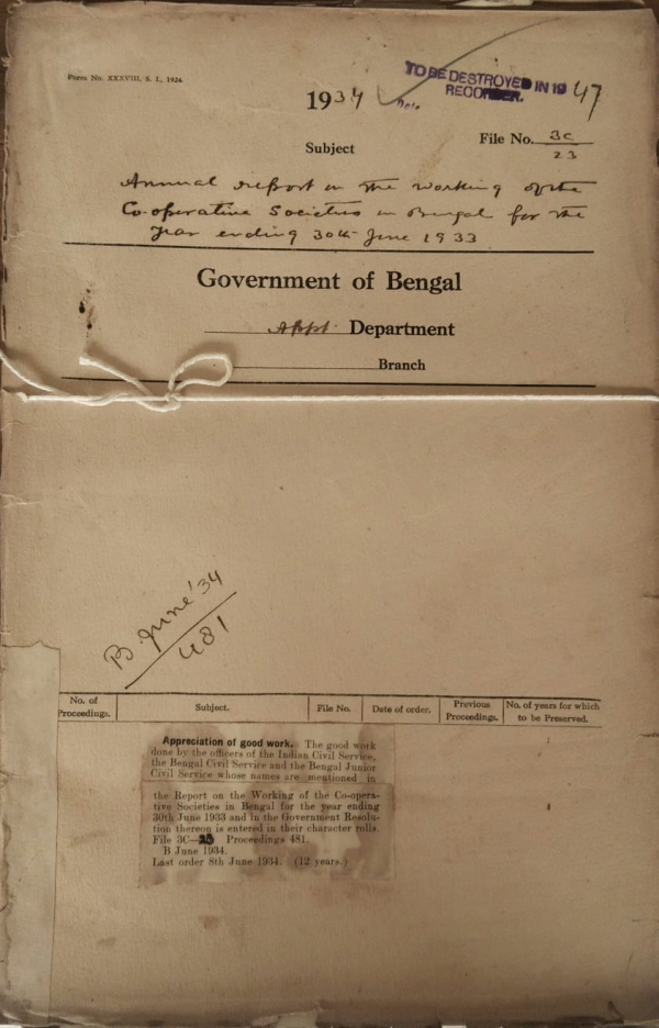 | Rack No. 2, Bundle No. 8, Sl No. 449 Postings of ICS officers (Judicial) in June & July. | Rack No. 2, Bundle No. 8, Sl No. 450 Proposed confirmation of certain B.C.S. (Judl.) officers in listed posts of District and sessionion judges. | Rack No. 2, Bundle No. 8, Sl No. 451 Posting of Deputy Magistrate & Deputy Collectors, May, 1934. | Rack No. 2, Bundle No. 8, Sl No. 452 Annual report on the working of the Co-operative Societies in Bengal, June 1933. | Rack No. 2, Bundle No. 8, Sl No. 453 Distribution of port folios and the appointment of the Honorable Sir B.L. Mitter, K.C.S.I. and the Honorable Khwaja Nazim Uddin K.C.I.E. as member of the Bengal Executive council. | Rack No. 2, Bundle No. 8, Sl No. 454 Supply of Character reports of Bengal Civil Service officers recommended for promotion to listed posts of District Session Judges. | Rack No. 2, Bundle No. 8, Sl No. 455 T.A. of Mulvi Chaudhuri Abid Ali, Sub Deputy Collector, Noakhali. |