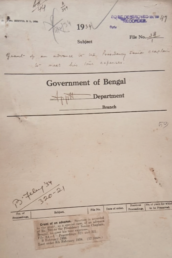 | Rack No. 2, Bundle No. 03, Sl No. 156 Application for an advance from the G.P. Fund (Babu Sukumar Chatarji, M.B.E.). | Rack No. 2, Bundle No. 03, Sl No. 157 Appointment of the Revd. R.E. Lee to act as a member of the Christian Burial Board. | Rack No. 2, Bundle No. 03, Sl No. 158 Communication of the reasons of the addition of Rs. 98,000 under "22-General Administration during 1932-33. | Rack No. 2, Bundle No. 03, Sl No. 159 Grant of an advance to the Presidency senior Chaplain, to meet his tour expenses. | Rack No. 2, Bundle No. 03, Sl No. 160 Supply of statement regarding superior services (India) family pension fund rules to the A.G.C.R. | Rack No. 2, Bundle No. 03, Sl No. 161 Purchase of publications service for civil pension. | Rack No. 2, Bundle No. 03, Sl No. 162 Counting of military service for civil pension. |