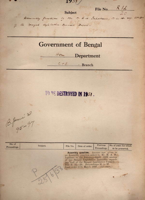 | Rack No. 08, Bundle No. 05, SI No. 236 Question whether the provisions of the Bengal Legislative Chambers Act, 1932 Can be Given retrospective effect. | Rack No. 08, Bundle No. 05, SI No. 237 Address to be presented to H.E. by Hill Maris Association. | Rack No. 08, Bundle No. 05, SI No. 238 Seasonal staff for the Bengal Legislative Council (B.L.C.). | Rack No. 08, Bundle No. 05, SI No. 239 A.Q. by Mr. M.A.H. Ispahani regarding staff of the B.L.C. | Rack No. 08, Bundle No. 05, SI No. 240 Statement showing menial staffs of the secretariat entitled to winter & Summer Liveries. | Rack No. 08, Bundle No. 05, SI No. 241 A.Q. by Mr. Dhanajoy Roy M.L.A. Regarding communal representation in the staff of the Assembly & Council Department. | Rack No. 08, Bundle No. 05, SI No. 242 Installation of telephones for the office & Registrar of the B.L.C. |