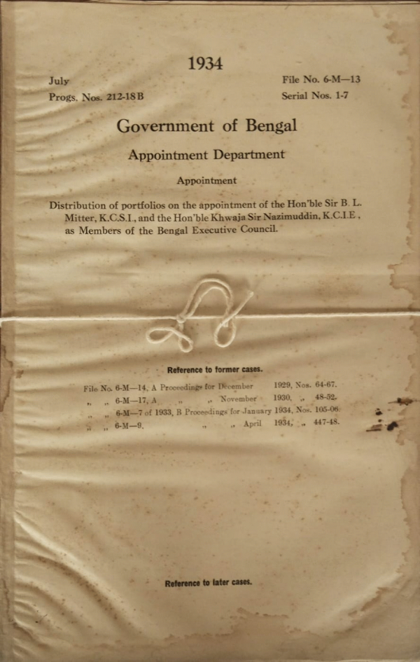 | Rack No. 2, Bundle No. 8, Sl No. 450 Proposed confirmation of certain B.C.S. (Judl.) officers in listed posts of District and sessionion judges. | Rack No. 2, Bundle No. 8, Sl No. 451 Posting of Deputy Magistrate & Deputy Collectors, May, 1934. | Rack No. 2, Bundle No. 8, Sl No. 452 Annual report on the working of the Co-operative Societies in Bengal, June 1933. | Rack No. 2, Bundle No. 8, Sl No. 453 Distribution of port folios and the appointment of the Honorable Sir B.L. Mitter, K.C.S.I. and the Honorable Khwaja Nazim Uddin K.C.I.E. as member of the Bengal Executive council. | Rack No. 2, Bundle No. 8, Sl No. 454 Supply of Character reports of Bengal Civil Service officers recommended for promotion to listed posts of District Session Judges. | Rack No. 2, Bundle No. 8, Sl No. 455 T.A. of Mulvi Chaudhuri Abid Ali, Sub Deputy Collector, Noakhali. | Rack No. 2, Bundle No. 8, Sl No. 456 Third class powers of Babu Satya Charan Bhattacharjee Probationary Deputy Magistrate Howrah. |