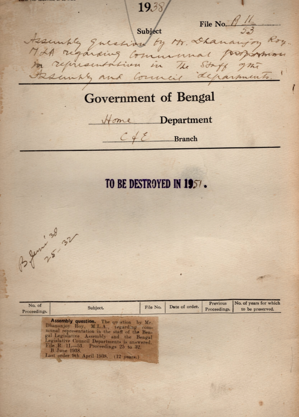 | Rack No. 08, Bundle No. 05, SI No. 238 Seasonal staff for the Bengal Legislative Council (B.L.C.). | Rack No. 08, Bundle No. 05, SI No. 239 A.Q. by Mr. M.A.H. Ispahani regarding staff of the B.L.C. | Rack No. 08, Bundle No. 05, SI No. 240 Statement showing menial staffs of the secretariat entitled to winter & Summer Liveries. | Rack No. 08, Bundle No. 05, SI No. 241 A.Q. by Mr. Dhanajoy Roy M.L.A. Regarding communal representation in the staff of the Assembly & Council Department. | Rack No. 08, Bundle No. 05, SI No. 242 Installation of telephones for the office & Registrar of the B.L.C. | Rack No. 08, Bundle No. 05, SI No. 243 Reports of the Provincial Delimitation on committee of other local govt. + the final decision on the recommendation of the Committee. | Rack No. 08, Bundle No. 05, SI No. 244 C.Q by Khan Bahadur Syed Muazzam Uddin Hossain regarding allotment of days for non-business in the council. |