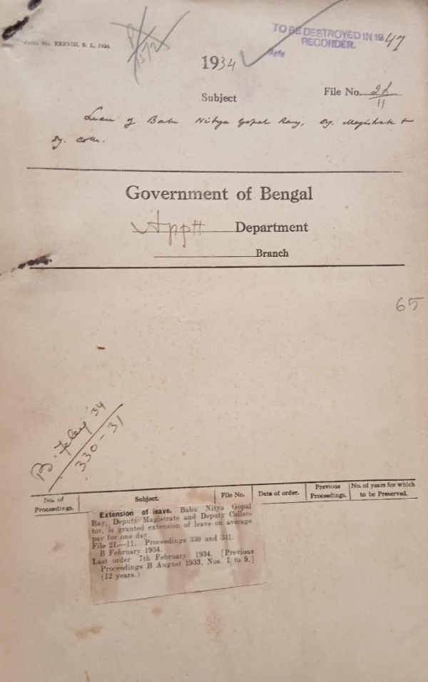 | Rack No. 2, Bundle No. 03, Sl No. 162 Counting of military service for civil pension. | Rack No. 2, Bundle No. 03, Sl No. 163 Distribution of Department between A and I and Revenue Secretaries. | Rack No. 2, Bundle No. 03, Sl No. 164 Disposal of criminal case in the district of Nokhali. | Rack No. 2, Bundle No. 03, Sl No. 165 Extension of leave of Babu Nitya Gopal Roy Deputy Magistrate and Deputy Collector. | Rack No. 2, Bundle No. 03, Sl No. 166 Posting of Khan Bahadur Muhammad Fazlul Karim, Deputy Magistrate and Deputy Collector on relieved of his officiating, A.D.M. Mymensingh. | Rack No. 2, Bundle No. 03, Sl No. 167 Extension of leave of Babu Rebati Nath Chatarji, Deputy Magistrate and Deputy Collector. | Rack No. 2, Bundle No. 03, Sl No. 168 Confirmation of Messrs S.D. Stephens and K. Tolson, in the interior scale of the Indian Police. |