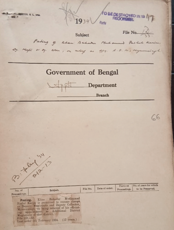 | Rack No. 2, Bundle No. 03, Sl No. 163 Distribution of Department between A and I and Revenue Secretaries. | Rack No. 2, Bundle No. 03, Sl No. 164 Disposal of criminal case in the district of Nokhali. | Rack No. 2, Bundle No. 03, Sl No. 165 Extension of leave of Babu Nitya Gopal Roy Deputy Magistrate and Deputy Collector. | Rack No. 2, Bundle No. 03, Sl No. 166 Posting of Khan Bahadur Muhammad Fazlul Karim, Deputy Magistrate and Deputy Collector on relieved of his officiating, A.D.M. Mymensingh. | Rack No. 2, Bundle No. 03, Sl No. 167 Extension of leave of Babu Rebati Nath Chatarji, Deputy Magistrate and Deputy Collector. | Rack No. 2, Bundle No. 03, Sl No. 168 Confirmation of Messrs S.D. Stephens and K. Tolson, in the interior scale of the Indian Police. | Rack No. 2, Bundle No. 03, Sl No. 169 Cancellation of marriage license granted to the staff captain william francis of the Salvation Army. |