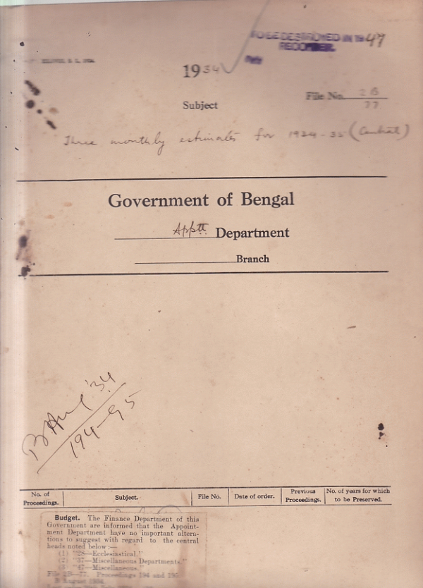 | Rack No. 02, Bundle No. 12, Sl No. 789 Schedules of new schemes for inclusion in the budget for 1935-36. | Rack No. 02, Bundle No. 12, Sl No. 790 Amendment to the Bengal Passage Rules, 1927. | Rack No. 02, Bundle No. 12, Sl No. 791 Replacing the services of Mr. P.D. Martyr, I.C.S. at the Disposal of the Appointment Department. | Rack No. 02, Bundle No. 12, Sl No. 792 Three monthly estimates for 1934-35 (Central). | Rack No. 02, Bundle No. 12, Sl No. 793 Statement of grant and expenditure for the year 1933-34, under, 37.C. Examination | Rack No. 02, Bundle No. 12, Sl No. 794 Procedure for sending requisitions for electrical works and repairs. | Rack No. 02, Bundle No. 12, Sl No. 795 Supply bills and telegraphic transfers. |