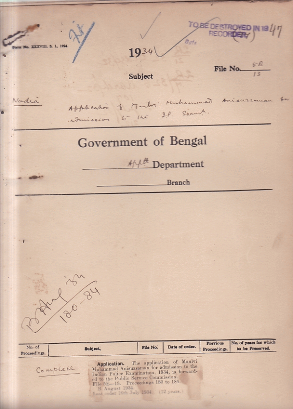 Application of Mulvi Muhammad Anisuzzaman for admission to the Indian Police Exam.