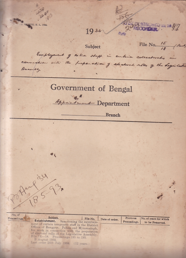 | Rack No. 02, Bundle No. 12, Sl No. 798 Application of Mulvi Muhammad Anisuzzaman for admission to the Indian Police Exam. | Rack No. 02, Bundle No. 12, Sl No. 799 Return of expenditure on stores purchased in India during 1933-34. | Rack No. 02, Bundle No. 12, Sl No. 800 Amendment to Government Servants conducts Rules | Rack No. 02, Bundle No. 12, Sl No. 801 Employment of Extra staff in certain collectorate in connection with preparation of electoral rolls of the Legislative Assembly. | Rack No. 02, Bundle No. 12, Sl No. 802 Extension of service of Rai Jitendra Nath Sarkar Bahadur, Assistant Secretary Revenue Department Governmentof Bengal. | Rack No. 02, Bundle No. 12, Sl No. 803 Acting promotions to the Selection Grade of District Judges. | Rack No. 02, Bundle No. 12, Sl No. 804 Conduct of Babu Anadi Nath Sarkar, Sub-Deputy Collector and Manager, Khanjanpur Khas Mahals, Bogra. |