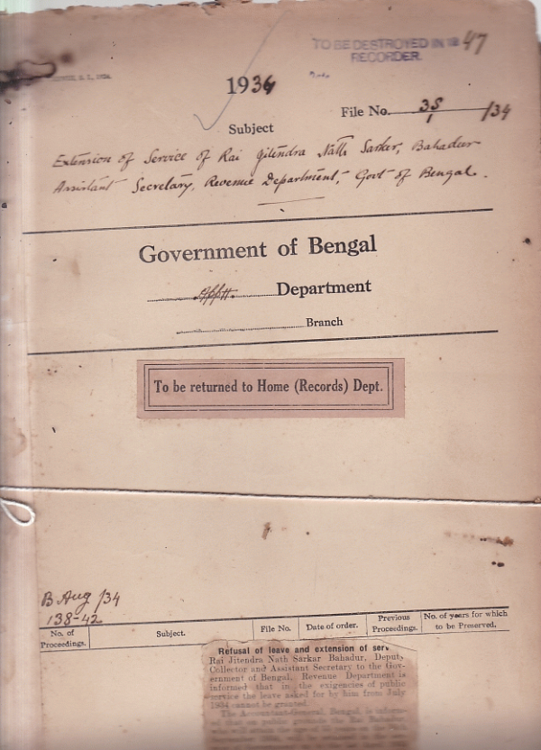 Extension of service of Rai Jitendra Nath Sarkar Bahadur, Assistant Secretary Revenue Department Governmentof Bengal.