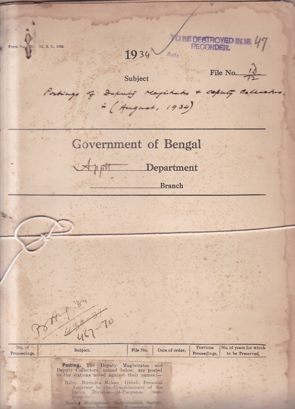 | Rack No. 02, Bundle No. 12, Sl No. 803 Acting promotions to the Selection Grade of District Judges. | Rack No. 02, Bundle No. 12, Sl No. 804 Conduct of Babu Anadi Nath Sarkar, Sub-Deputy Collector and Manager, Khanjanpur Khas Mahals, Bogra. | Rack No. 02, Bundle No. 12, Sl No. 805 Appointment of a special Tribunal at Darjeeling. | Rack No. 02, Bundle No. 13, Sl No. 806 Posting of Deputy Magistrate and Deputy Collectors in (August 1934). | Rack No. 02, Bundle No. 13, Sl No. 807 Application of Babu Santosh Kumar Royani Sarkar for the inclusion of the Behara Community in the list of Depressed a Backward Classes. | Rack No. 02, Bundle No. 13, Sl No. 808 Deputation of the All-Bengal Depressed classes, Federation to his Excellency the Governor. | Rack No. 02, Bundle No. 13, Sl No. 809 Appellate powers of Babu Upendra Mohan Basu, Deputy Magistrate, Mymensingh. |