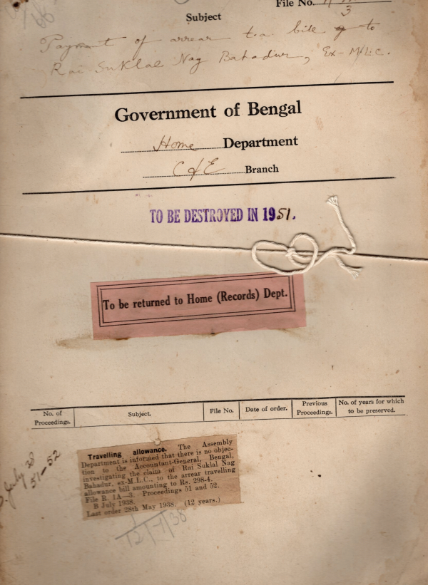 | Rack No. 08, Bundle No. 05, SI No. 251 Title to compensatory allowance during leave. | Rack No. 08, Bundle No. 05, SI No. 252 Rail accommodation for persons holding high office under the Crown in India + the president + the speaker of B.L.C. | Rack No. 08, Bundle No. 05, SI No. 253 Eligibility of the Subjects of Indian states to hold Civil officers under the Crown in India. | Rack No. 08, Bundle No. 05, SI No. 254 Payment of arrear T.A. bill to Rai Suklal Nag. Bahadur, Ex- M.L.C. | Rack No. 08, Bundle No. 05, SI No. 255 Amendments to the general Provident Fund Rules + The contributory Rules + the Contributory Provident Fund Rules (Bengal). | Rack No. 08, Bundle No. 05, SI No. 256 Proposed appointment of Chief & Other whips in the Legislative Council & Assembly. | Rack No. 08, Bundle No. 05, SI No. 257 Address presented to H.E. at Ctg. & reply threats. |