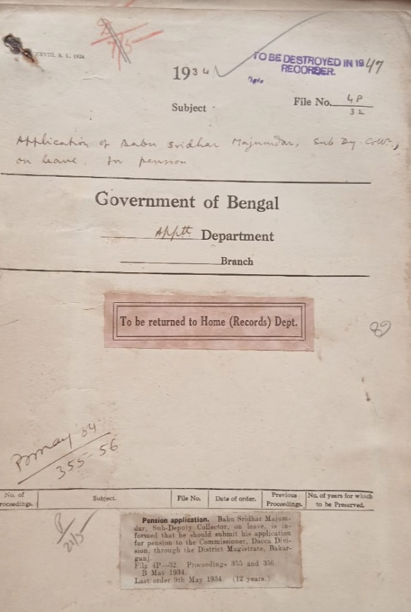 Application of Babu Sridhar Majumdar, Sub-Deputy Collector on leave, for Pension.