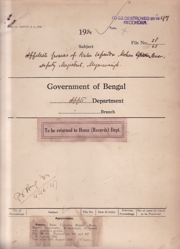 | Rack No. 02, Bundle No. 13, Sl No. 807 Application of Babu Santosh Kumar Royani Sarkar for the inclusion of the Behara Community in the list of Depressed a Backward Classes. | Rack No. 02, Bundle No. 13, Sl No. 808 Deputation of the All-Bengal Depressed classes, Federation to his Excellency the Governor. | Rack No. 02, Bundle No. 13, Sl No. 809 Appellate powers of Babu Upendra Mohan Basu, Deputy Magistrate, Mymensingh. | Rack No. 02, Bundle No. 13, Sl No. 810 Summary powers of Mr. Viresh Chandra Datta Deputy Magistrate Dinajpur. | Rack No. 02, Bundle No. 13, Sl No. 811 Note from Rai Sahib Panchanan Barma regarding appointment of Backward class to Ministerial service in District of Dinajpur. | Rack No. 02, Bundle No. 13, Sl No. 812 Application of Babu Mohit Kumar Banerjee for admission to the Indian Police Examination. | Rack No. 02, Bundle No. 13, Sl No. 813 T.A. of commissioners of Divisions to attend the meetings of a committee of Selection Board at Darjeeling. |