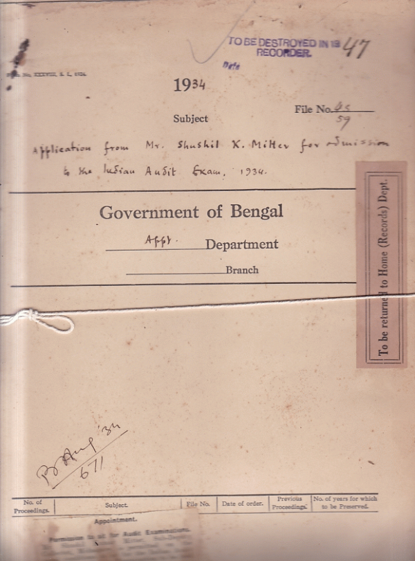 Application from Mr. Shushil Kumar Mitter for admission to the Indian Audit Examination 1934.