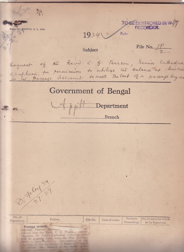 Request of the Rev. C.G. Pearson senior Cathedral Chaplain for permission to utilize the balance at his credit in the passage account to meet the cost of a passage by Air ways.
