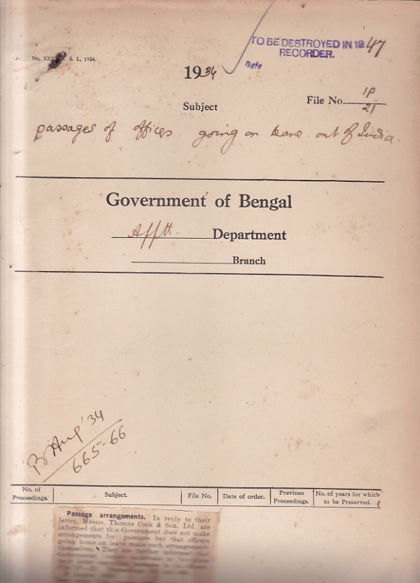 | Rack No. 02, Bundle No. 13, Sl No. 817 Posting of the candidates who appeared at the lost B.C.S. Examination. | Rack No. 02, Bundle No. 13, Sl No. 818 Expenditure incurred by the Chittagong Municipality for the preparation of electoral Rolls of the Legislative Assembly. | Rack No. 02, Bundle No. 13, Sl No. 819 Request of the Rev. C.G. Pearson senior Cathedral Chaplain for permission to utilize the balance at his credit in the passage account to meet the cost of a passage by Air ways. | Rack No. 02, Bundle No. 13, Sl No. 820 Passages of officers going home olive of India. | Rack No. 02, Bundle No. 13, Sl No. 821 Death report of Babu Saktipada Chakrabatti, Assistant Commissioner of Police Calcutta on leave. | Rack No. 02, Bundle No. 13, Sl No. 822 Proposal for amendment of Criminal Procedure Code regarding appointment of special Magistrate to try cases under section 110 Cri. P.C. with. | Rack No. 02, Bundle No. 13, Sl No. 823 Authentication of orders issued by the Governmentof India. |
