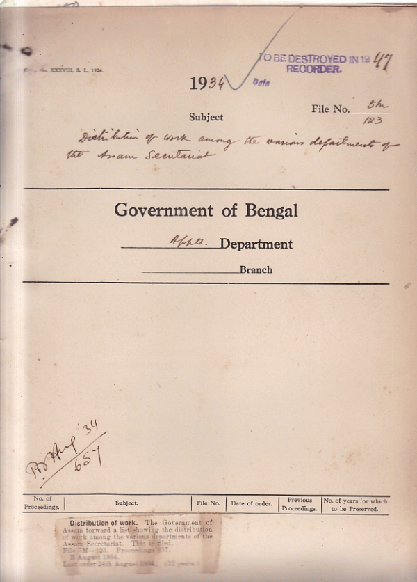 | Rack No. 02, Bundle No. 13, Sl No. 822 Proposal for amendment of Criminal Procedure Code regarding appointment of special Magistrate to try cases under section 110 Cri. P.C. with. | Rack No. 02, Bundle No. 13, Sl No. 823 Authentication of orders issued by the Governmentof India. | Rack No. 02, Bundle No. 13, Sl No. 824 Extension of the temporary post of Additional Sessionions judge 24-Parganas. | Rack No. 02, Bundle No. 13, Sl No. 825 Distribution of work among the various departments of the Assam Secretariat. | Rack No. 02, Bundle No. 13, Sl No. 826 Contributory provident Fund India. | Rack No. 02, Bundle No. 13, Sl No. 827 Statement of Appropriation and Expenditure under "37" Miscellaneous Department Examines for 1933-34. | Rack No. 02, Bundle No. 13, Sl No. 828 Employment of women in service. |