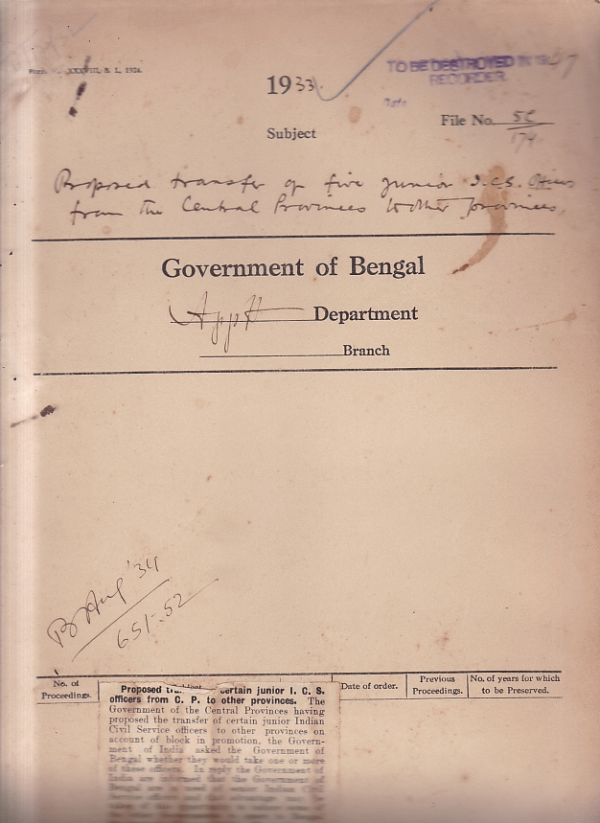 | Rack No. 02, Bundle No. 13, Sl No. 826 Contributory provident Fund India. | Rack No. 02, Bundle No. 13, Sl No. 827 Statement of Appropriation and Expenditure under "37" Miscellaneous Department Examines for 1933-34. | Rack No. 02, Bundle No. 13, Sl No. 828 Employment of women in service. | Rack No. 02, Bundle No. 13, Sl No. 829 Proposed transfer of live Junior Indian Civil Service officers from the Central Provinces to other province. | Rack No. 02, Bundle No. 13, Sl No. 830 Withdrawal of provident Fund Deposits for payment of insurance premium on pure endowment polices. | Rack No. 02, Bundle No. 13, Sl No. 831 Application for admission to the I.P. Examination by Babu Amal Chandra Bagchi. | Rack No. 02, Bundle No. 13, Sl No. 832 Application of Maulvi Syed Abu Daud Fakhruddin Ahmed for admission to the I.P. Examination. |